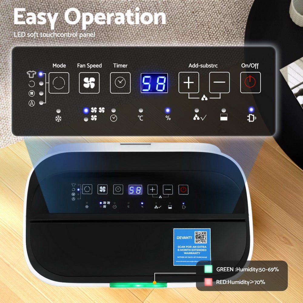 Say goodbye to dampness, musty smells, and slow-drying laundry with the Devanti 20L Dehumidifier.