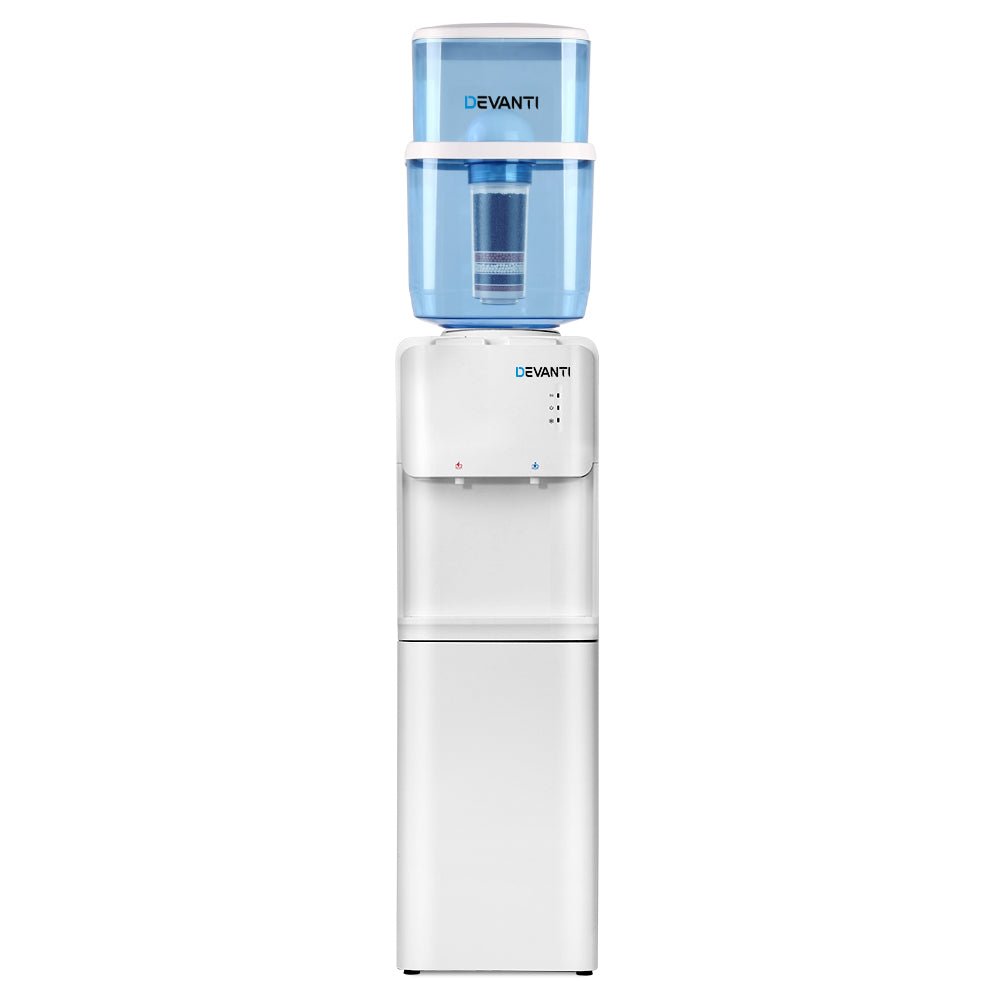 Have access to cleaner and purer water at all times with the Devanti Water Cooler. With a refillable container capacity of 22 litres, the cooler is large enough to provide purified water on demand hassle-free. Thanks to its 7-stage filtration system that ensures your water tastes great and free of harmful chemicals and impurities. The water cooler comprises a food-grade plastic container and metal cooler that features an electronic refrigeration system. It comes with dual taps, to and cold water spouts and a hot-cold water on/off switch for easy use. The cooler also an adjustable tray height and a large storage cabinet to store accessories. Safety is also assured with a child-lock function to prevent accidental children tampering with the cooler as well as protection from over-current, overheating, electric shocks and drying up. Not least, the cooler comes with a detachable water guide plate that enables the cooler to suit the water purifier container or any bottled water.