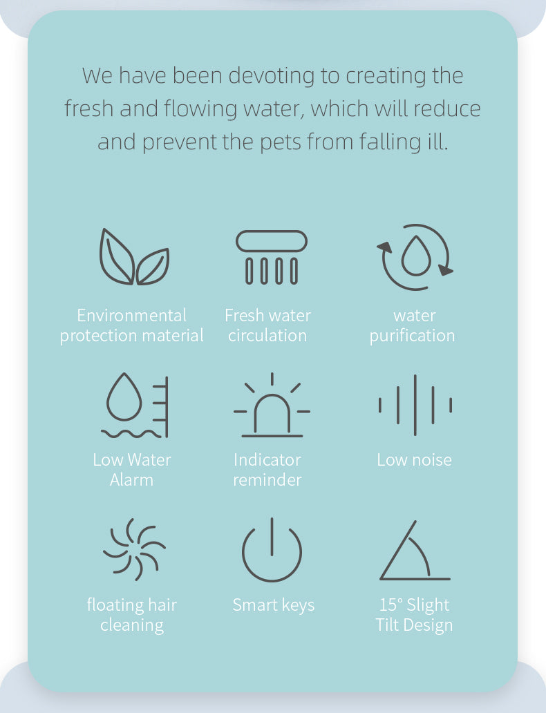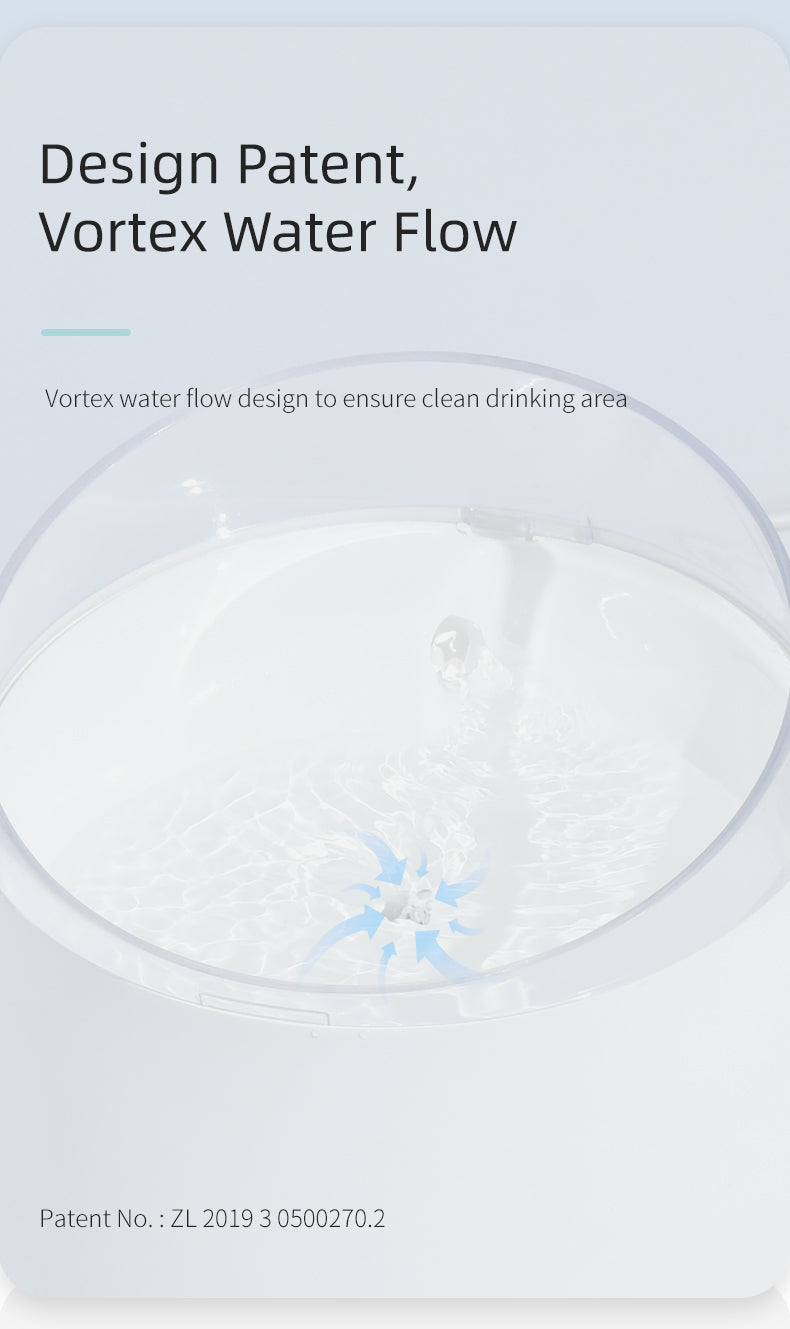 - Patented Water Vortex -A patented water vortex filtrates hair, excess dirt and washes down the fountain walls so you don’t have to every time you fill it. Water is also maintained in constant motion to keep it fresh.