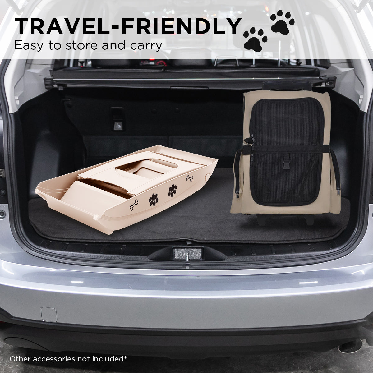 This pet ramp folds flat, with a low profile for easy storage in your home, car or garage. Each step has a non-slip mat to keep little paws secure as they climb. Choose from three elegant colours and find the perfect match for your furry pals!