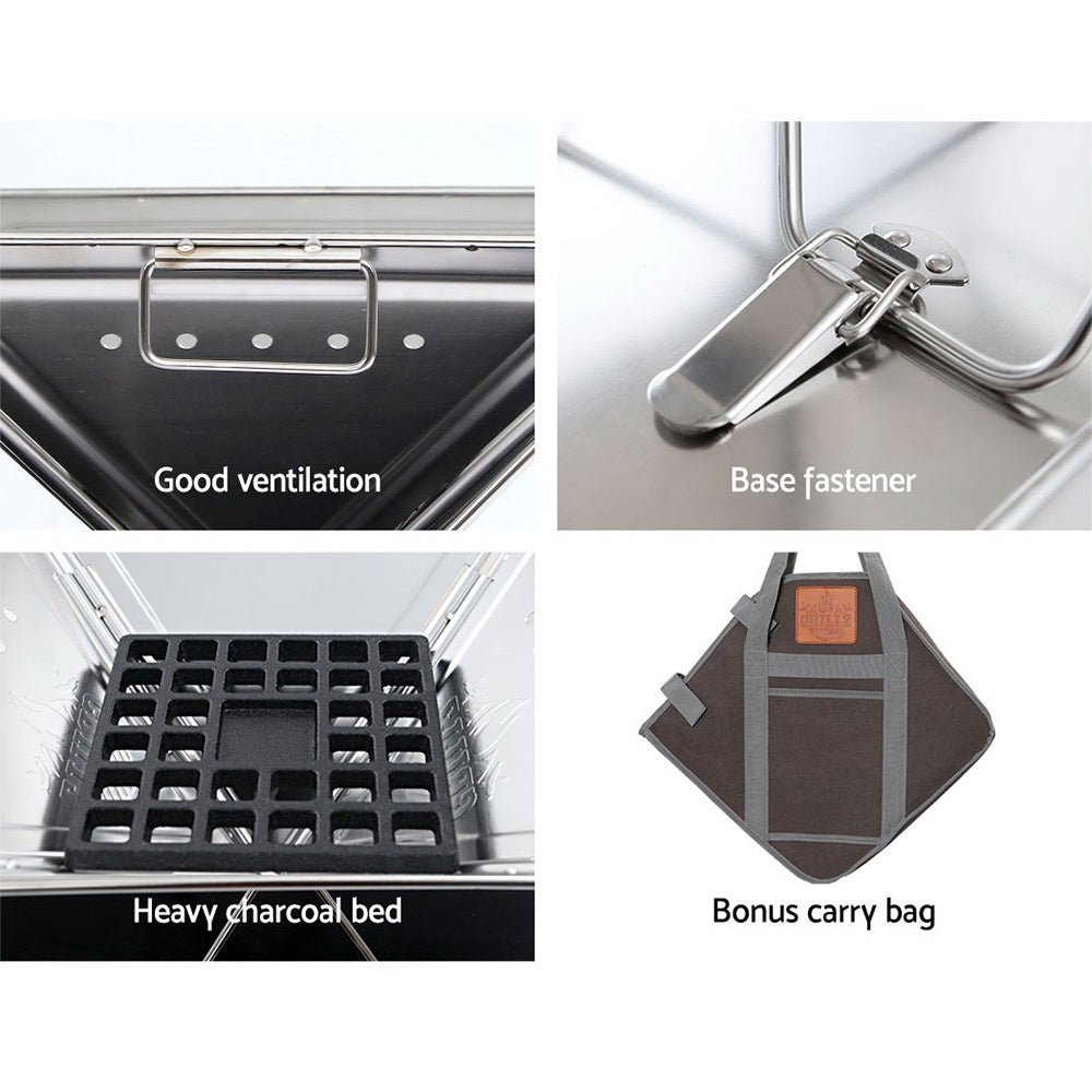 With our Grillz Portable Fire Pit BBQ, you can expect some genuine all-season enjoyment all round. First, as a fire pit, it is simply great sitting around a nice warm fire with friends and family to chat the day or night away. And should you decide to up the ante and have a sumptuous BBQ instead, just load on the food for some great feastings. Both the body and grill parts are made of food-grade stainless steel, meaning they are completely safe for cooking, and strong and durable too. There is also a fastener for connecting the legs to the bottom tray for stability and safety. The grill rack is large and height-adjustable so that you can cater to large groups and always have the perfect amount of heat for whatever is cooking. And for a consistent good fire, the fire pit BBQ is designed with ample ventilation to let air flow through easily. Best of all, it folds flat for easy storage and transportation so that you can set it up on your lawn, deck and patio or even in caravan parks and camping sites. A bonus carry bag is also included for effortless, one-handed carrying. So all you need to do now is light up some wood or charcoal fire and get cosy for a great time around the fire pit.