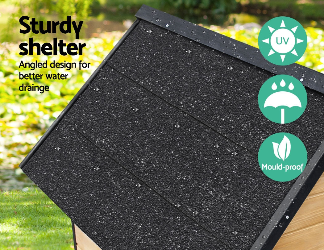 Top quality and durable, this is a pet dog house that prioritises comfort. With a fir wood construction, this dog house is designed to maximise comfort. Featuring an asphalt felt roof, it insulates your pup from the heat during summer and against the rain in winter. It is raised on small legs with rubber feet to prevent wet rot from rising to the timber. High quality, anti-termite, pest-resistant and is made of TUV approved eco-friendly materials. Architecturally designed inside and out , this will surely make your little pup bark with glee!