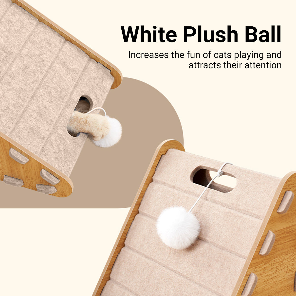 This triangular cat scratch board combines style and function, offering space for scratching, resting, and play. Made from durable felt with plush accents and solid wood panels, it provides both a stable vertical surface and a cosy hideaway. With its geometric design, it fits modern interiors while supporting healthy claw care and indoor activity.
