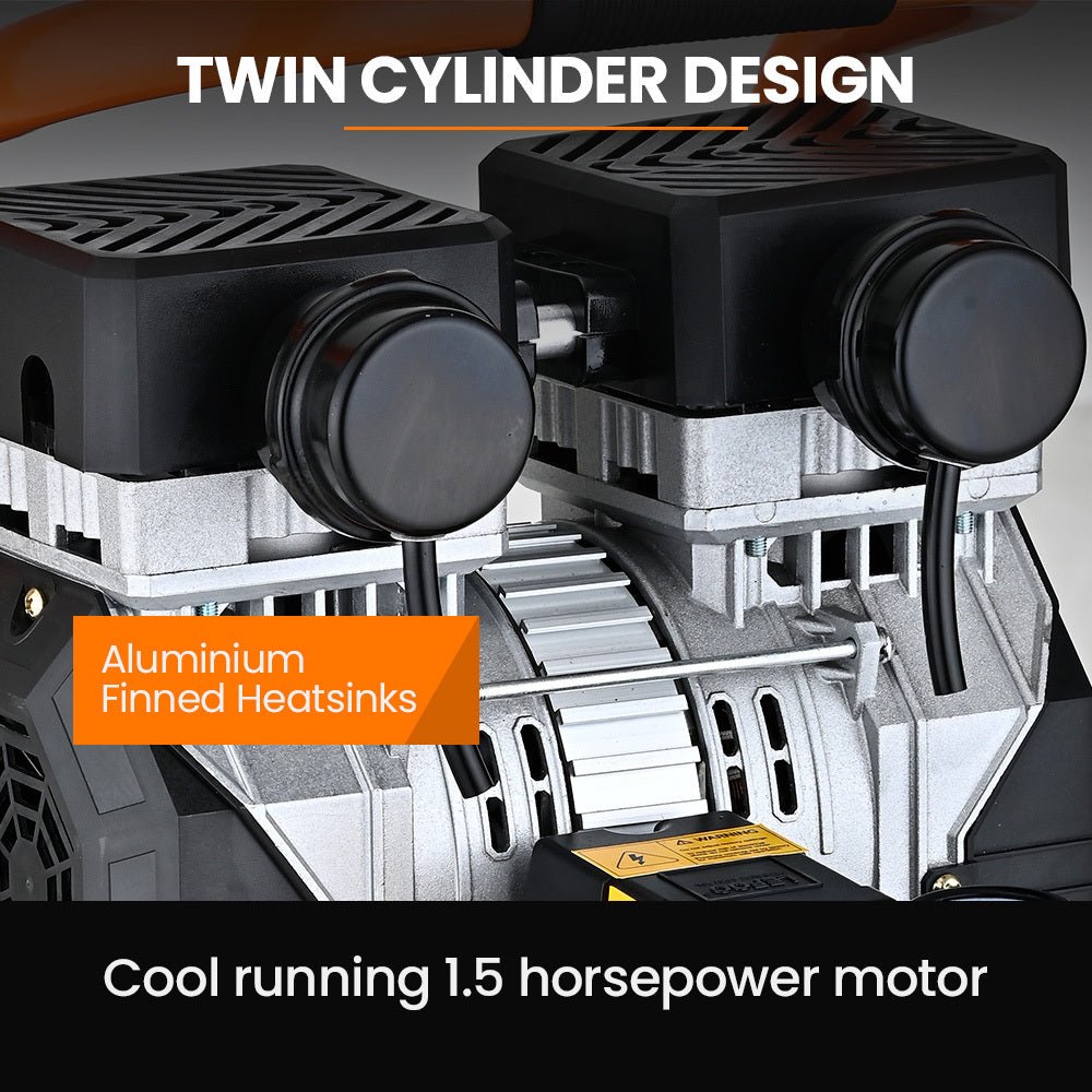 This air compressor has a 1.5hp twin-cylinder motor. The 2850 RPM motor is more than twice as fast as our competitors. It has fan-forced cooling and aluminium heatsinks that keep this high-performance motor running cool.
