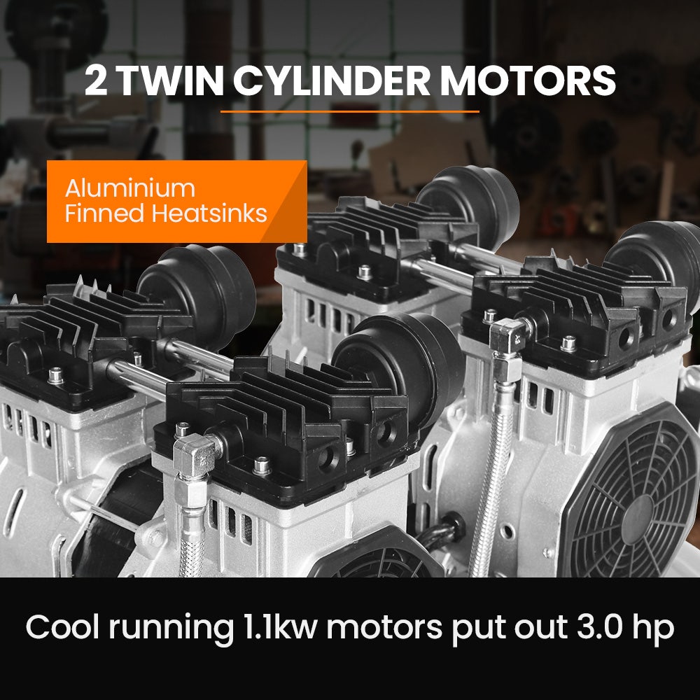 This ACM-500s Oil-Free Air Compressor is powered by 2 twin-cylinder 1.1kw motors which is equivalent to a total output of 3.0HP up to 40% more than other models on the market!