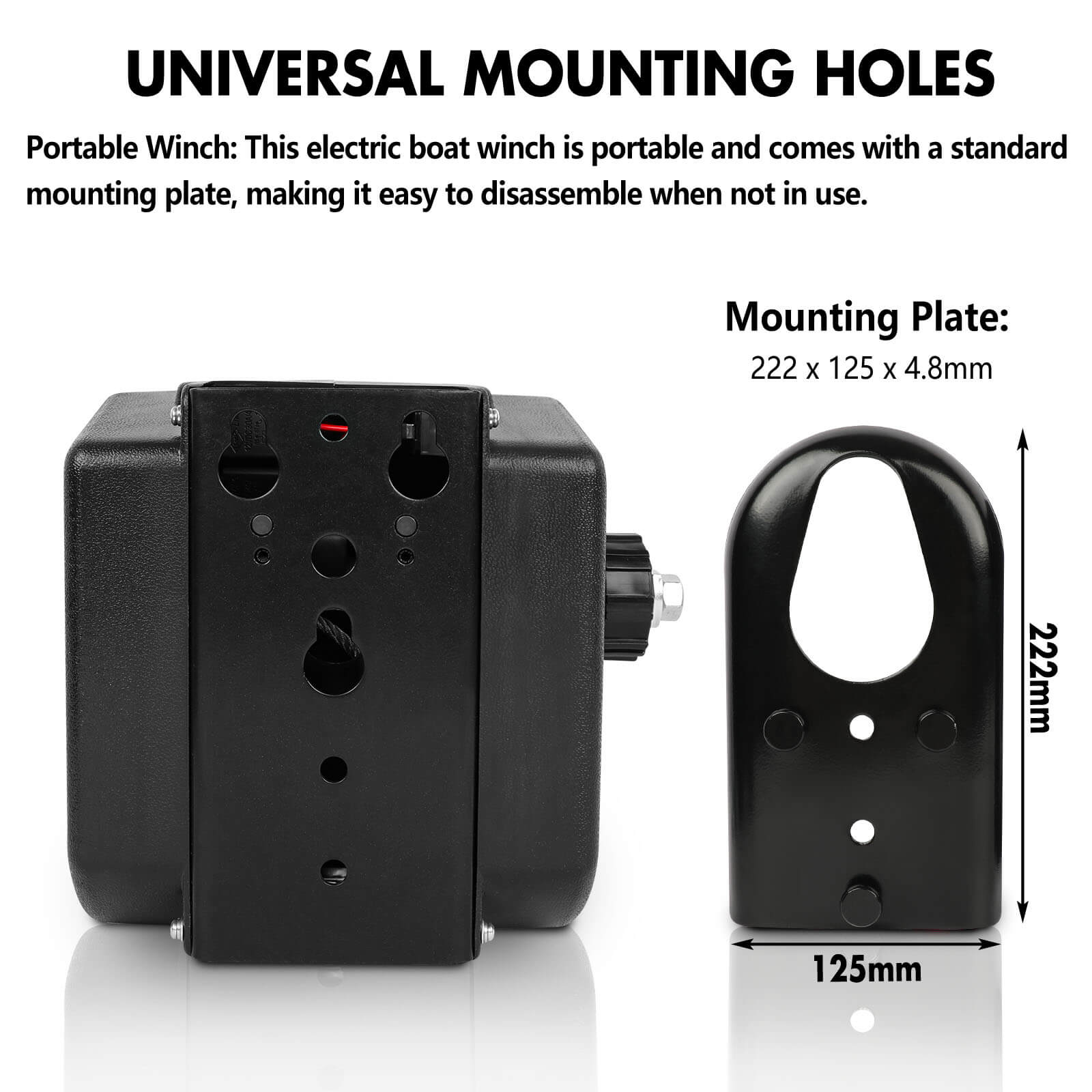 Portability Detachability: This electric boat winch is portable with an anti-slip handle and a tri-point mounting plate for easy detachment when not in use.